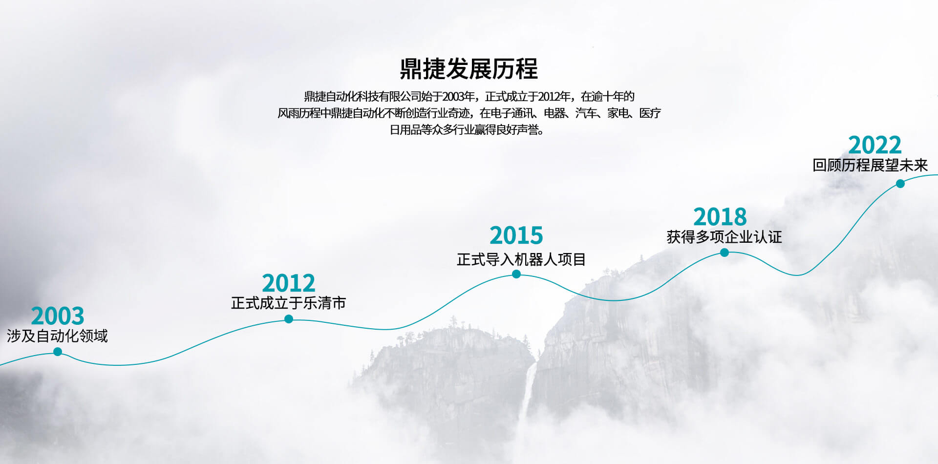 公司始于2012年,在逾十年的風雨歷程中,不斷創(chuàng)造行業(yè)奇跡,在電子通訊、電器、汽車、家電、醫(yī)療、日用品等眾多行業(yè)贏得良好聲譽。公司坐落于浙江省樂清經濟開發(fā)區(qū),現有人員63人,擁有經驗豐富的工程技術研發(fā)團隊11人,其中高級工程6人,具備本科以上學歷高級工程人員比例78%;同時鼎捷自動化在蘇州,東莞等地設立分公司以服務目標市場客戶,目前鼎捷自動化已經為下客戶提供配套自動化解決方案:泰科、安費諾、莫士、華為、中興、普聯(lián)、智英、意華、德豐、公牛、萬事達、華豐、飛雕、普思、冠聯(lián)、俊朗松田、進聯(lián)、高正、盛凌等。鼎捷自動化專業(yè)從事連接器、開關及相關電子、電器、五金、塑膠產品組裝自動化定制、設計、制造、銷售。2012年,鼎捷自動化正式導入機器人應用項目,可為各類客戶提供電子、電器、汽車、五金、塑膠等集成自動化智能組裝系統(tǒng)。